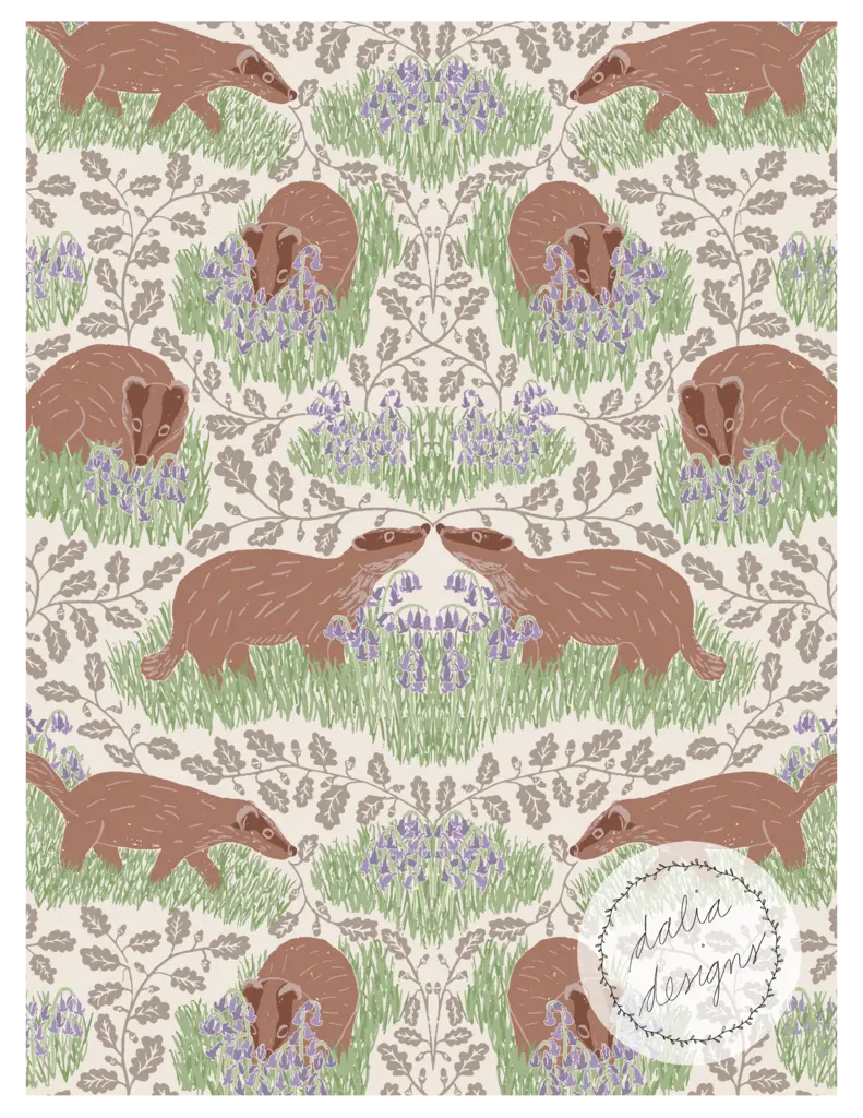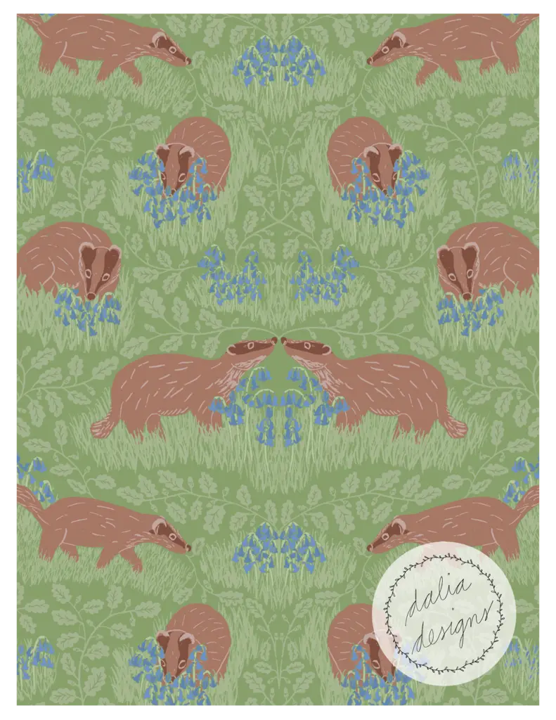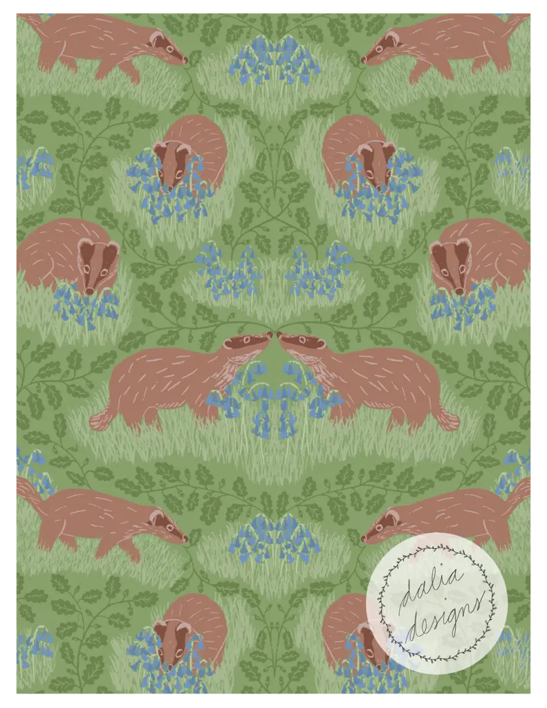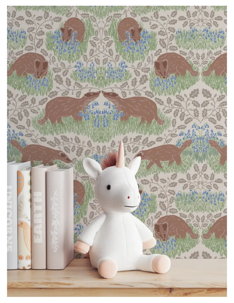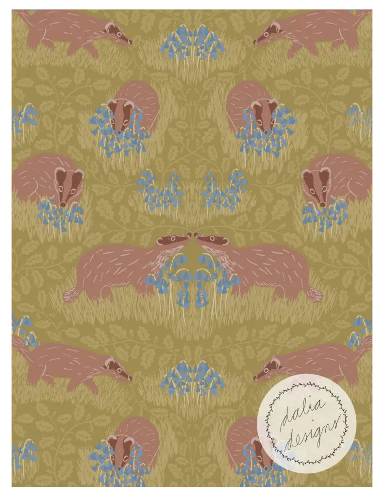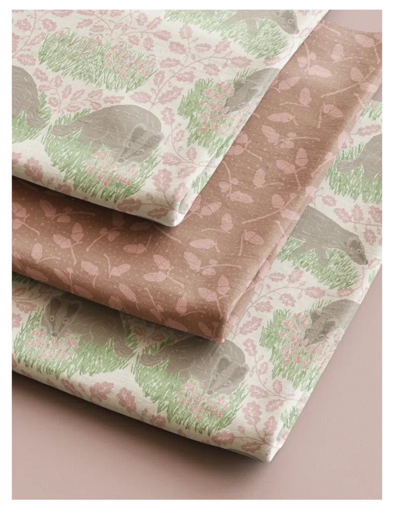 The Whimsical Woodland Mini Collection includes four playful patterns featuring badgers, squirrels, bluebells, acorns, and oak leaves. Designed with kids in mind, it has a fun and whimsical feel. The color palette is built around Pantone’s Color of the Year 2025, “Mocha Mousse,” blending soft and rich hues reminiscent of a late summer flower bouquet.