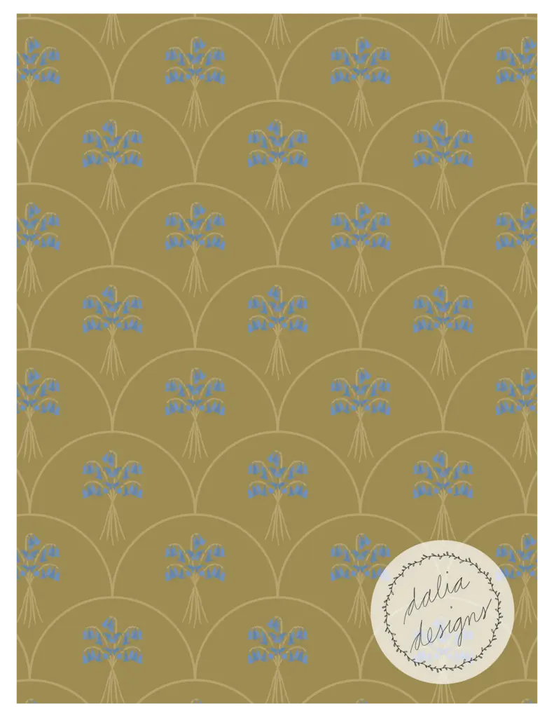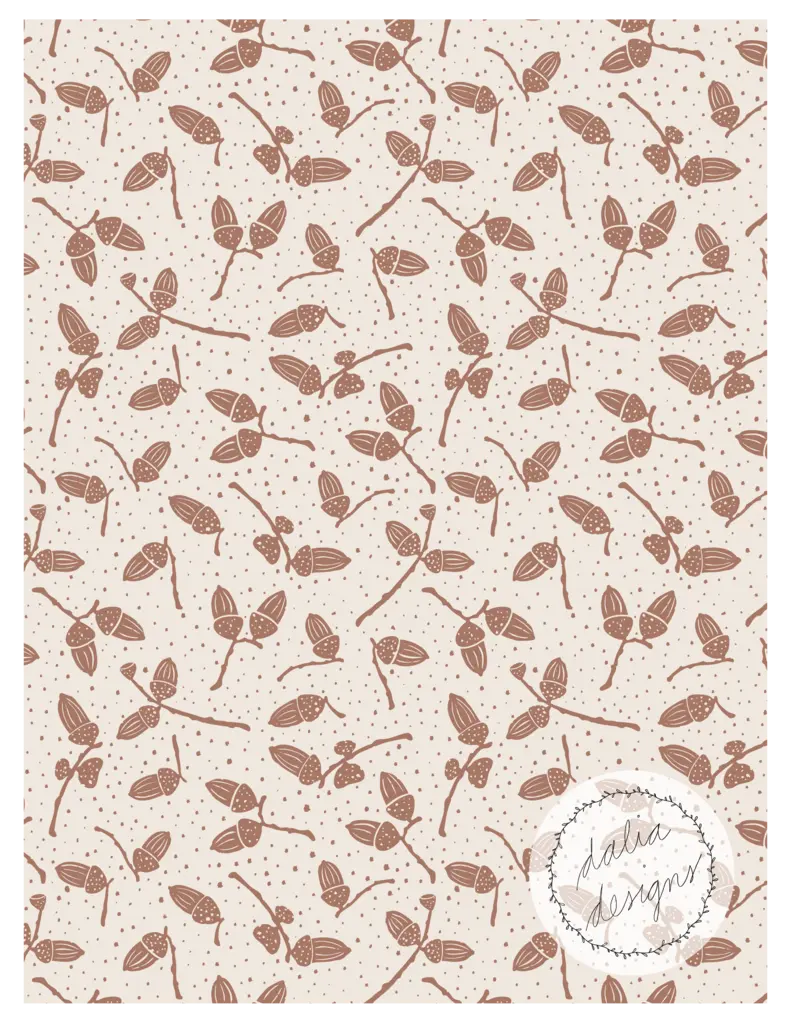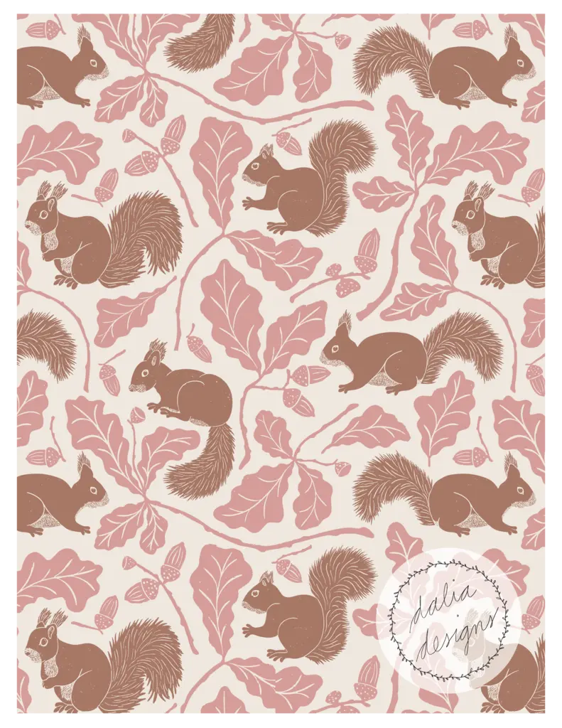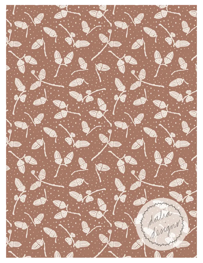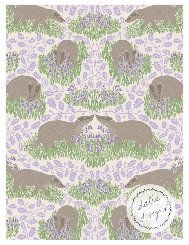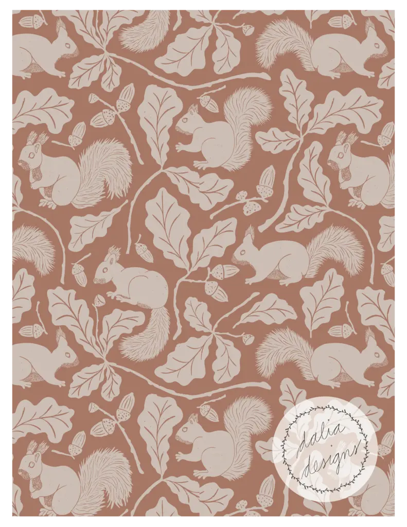 The Whimsical Woodland Mini Collection includes four playful patterns featuring badgers, squirrels, bluebells, acorns, and oak leaves. Designed with kids in mind, it has a fun and whimsical feel. The color palette is built around Pantone’s Color of the Year 2025, “Mocha Mousse,” blending soft and rich hues reminiscent of a late summer flower bouquet.